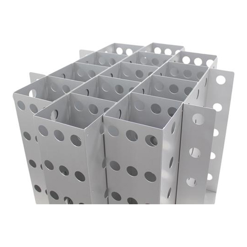 Verticals for storage in cryogenic vessels are similar to the verticals used in chest freezers. They are available with locking rods, spring clips, shelf lips and labels. They are manufactured in aluminium or stainless steel. Vertical cold stores for cryogenic vessels are also available with adjustable shelves ideal for storing different size microtiter plates. The shelves can be easily removed and re-positioned to store different size items.